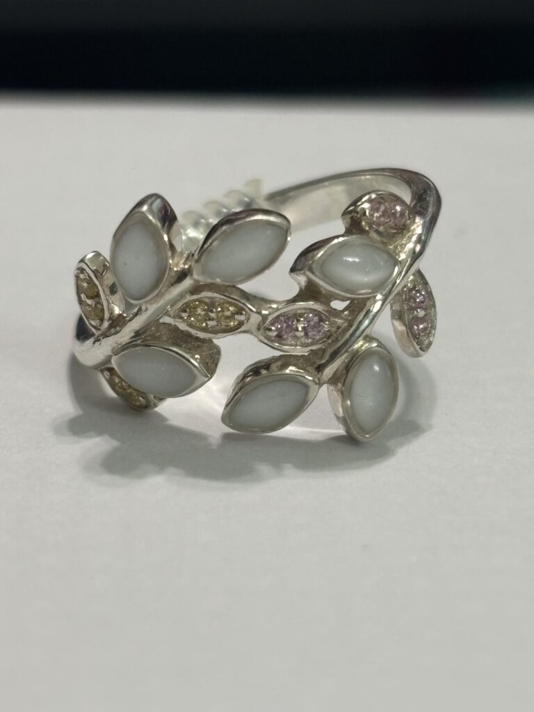 Our A Mother’s Embrace ring is a unique wrap-around ring that hugs your finger. Six dainty leaf-shaped breastmilk stones are intertwined amongst six cubic zirconia studded leaves, and the effect is lovely. The design and aesthetic of A Mother’s Embrace are beautiful reminders of the connection and bond you share with your child. Nothing is more comforting and supportive than a hug from a loved one, and wearing this ring is a reminder on many levels. Please note, this ring is not designed to be adjustable or flexible. Take extra care to avoid putting pressure on the band or pulling it.