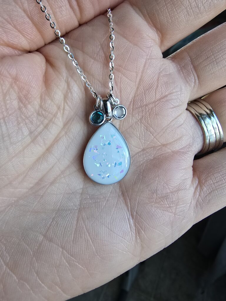 This necklace turned out beautiful! It reminds me of all the work put into feeding my 3 babies, but it was the most important work. It is a reminder that motherhood is tough, but beautiful. I love the birthstones, I was able to add one for my angel baby. So, I get to carry all 4 babies with me throughout the day.The opal flakes add that little bit of sparkle I love. I will definitely be returning to purchase another piece or two!