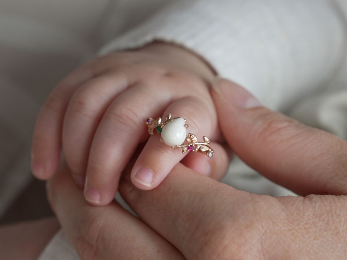 Enchanting breastmilk stone ring. Elegant and sophisticated, this ring features a 8×6-mm stone custom made from your breast milk, teardrop. Beautiful inlaid cubic zirconia and a skin-friendly 925 sterling silver ring core, plated in white gold or rose gold, ensure long-lasting use.