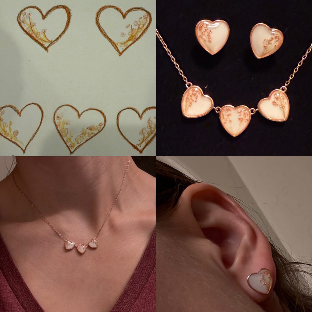 Three hearts for the three kids who have mine. I love how it sits between my collarbones and is just the right size, and it seems like a good quality necklace that will hold up well over time. Keepsakemom’s designers did a lovely job making this necklace exactly the way I imagined it. It is perfect. They even suggested that, in addition to my notes, I submit a drawing of my vision to their designers (which I highly recommend!) I had them use one child’s hair per heart in a botanical kind of arrangement with some tiny gold flakes. The necklace goes great with the earrings as well!
