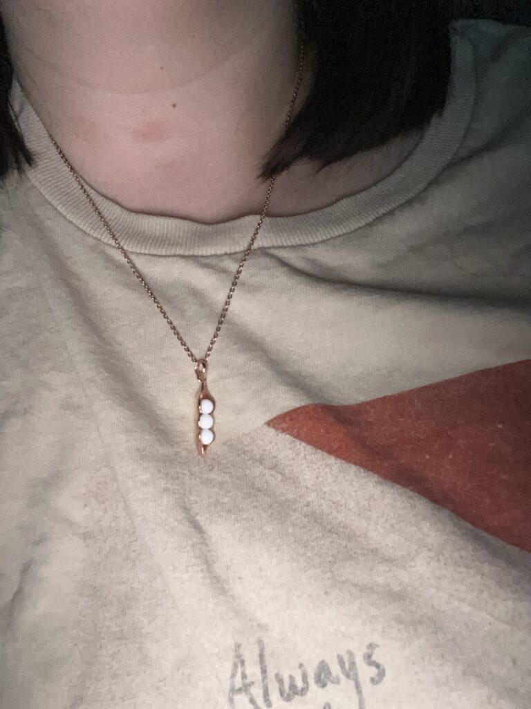The design is very cute love the pea pod idea the pendant is quite a bit smaller than I was anticipating and the chain is longer than I would prefer but all in all it is cute and I will cherish my memento.
